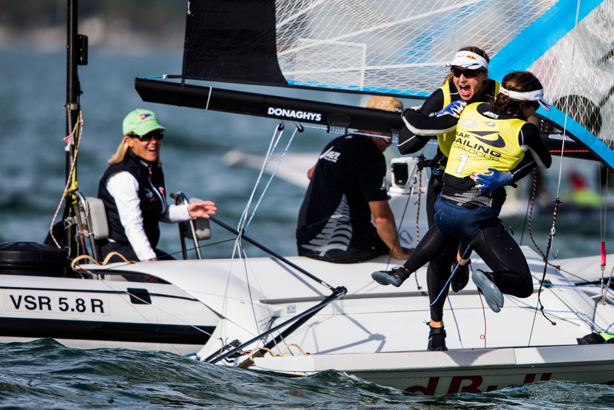 The real battle in the 49erFX was for silver and bronze with Jena Mai Hansen and Katja Salskov-Iversen (DEN) and Lisa Ericson and Hanna Klinga (SWE) split by one point.