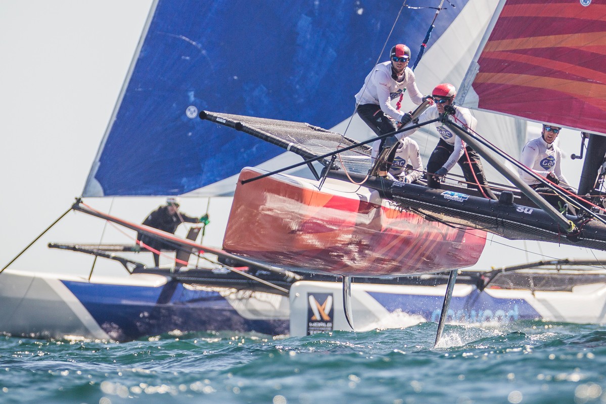 Finally in match three Sehested got his groove on, surging away to a good lead until – disaster – he capsized at the leeward turning mark. “I did a normal turn but I hadn’t noticed that our boards weren’t in their correct position,” said Sehested. “The leeward one was up and the windward one was down, and the lift from the windward board tipped us in. Frustrating, but that’s sailing. We gave Ian two of those races on a plate. But overall we’re pleased with how we sailed this week. A new team, we’re fast, and we’ll come back strong for the next event.”