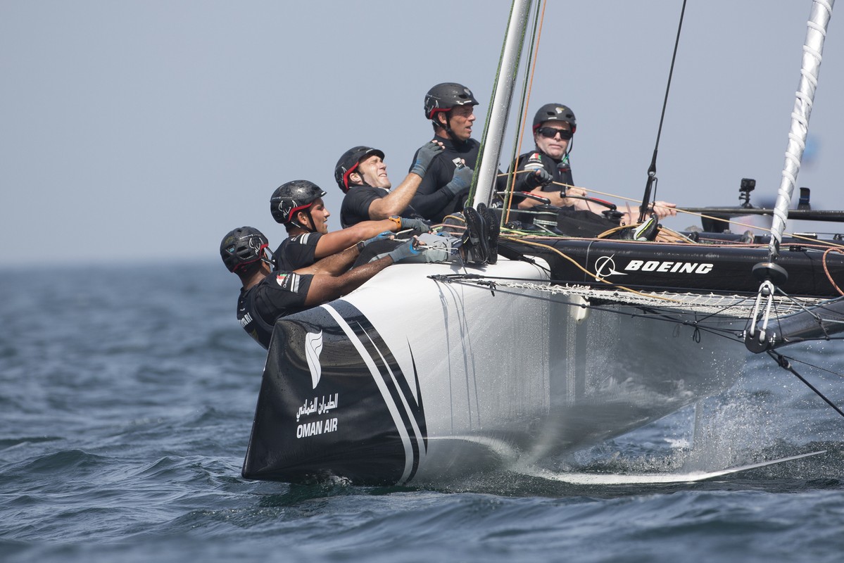 Three fast-paced races were sailed, and like magnificent men on their flying machine, Morgan Larson and his crew, which includes three former Extreme Sailing Series champions, took victory in two races, giving Oman Air a 14-point lead at the halfway stage of the event.