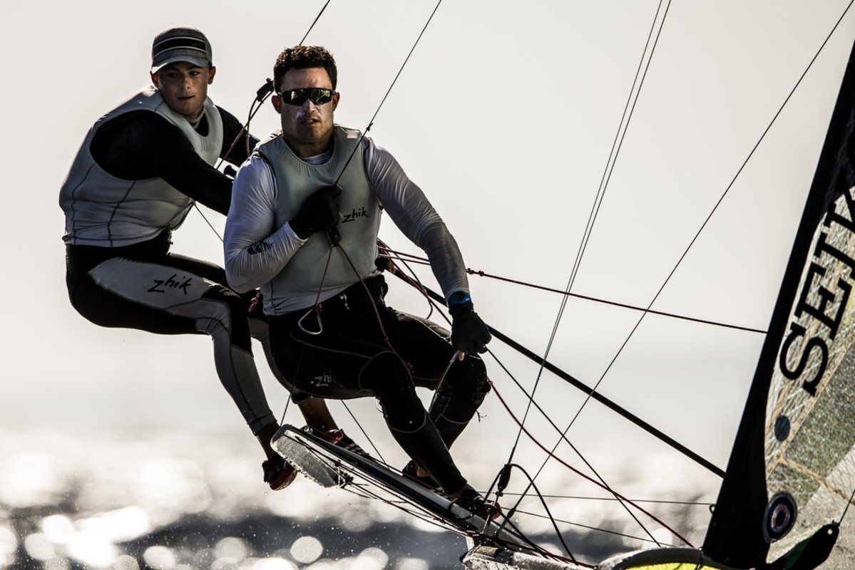 Training alliances are also founded between top crews from different nations. The philosophy of the best learning from close equals, and competition between each other, transcends national team boundaries. In the Nacra 17 Class the French four times world champions Billy Besson and Marie Riou train with Italy’s Vittorio Bissaro and Silvia Sicouri, inviting each other to camps in Cagliari and La Grande Motte respectively. The top two Nacra 17s on today’s rankings, after nine races are Besson and Riou who are now 22 points ahead of the young Italian world championshp bronze medallists.