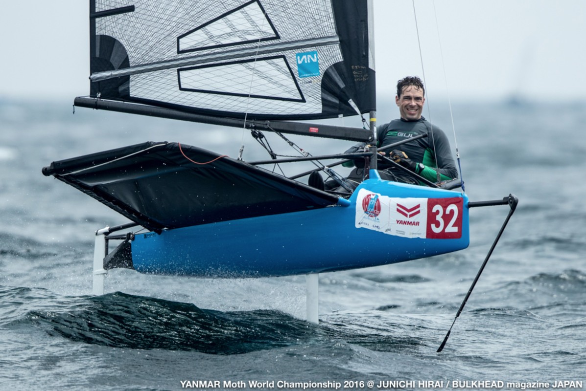 Great Britain’s Chris Rashley leads the way in Hayama, Japan after the second day of racing at the YANMAR Moth Worlds 2016.