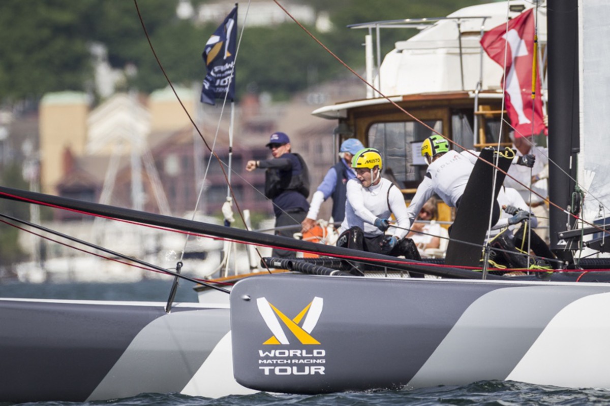 The World Match Racing Tour Newport entered its match racing phase today. While Newport Harbour was fog-free and blessed with sun all day, there was a long pause mid-way through the Qualifying Group Sail-offs as the wind slowly veered from the north into the sea breeze direction of the southeast.