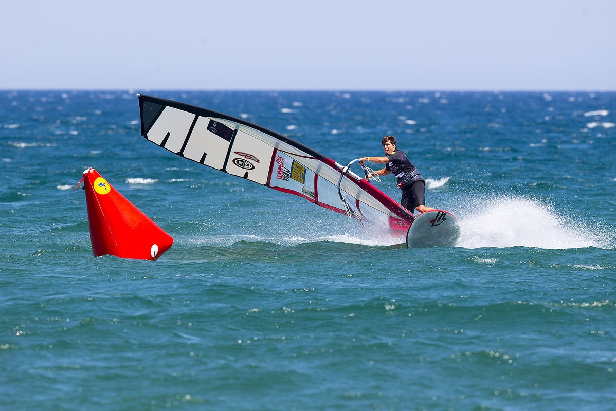 The winners’ final was completed at the second time of asking after Jimmy Diaz (Starboard / North) was a little too eager for a good start and was unfortunately disqualified for jumping the gun. As the remaining top 7 sailors approached the opening buoy it was Pierre Mortefon who managed to steal a narrow lead over Pascal Toselli (99NoveNove / Challenger Sails), who produced an excellent first gybe to leapfrog past Tristan Algret (Starboard / Severne) and Jordy Vonk (Fanatic / North). In the light winds the tussle for the top positions after the first gybe often proves crucial and this proved to be the case again as Mortefon made full use of the clean wind on offer to build a healthy lead as they rounded the final mark — before flying down the home straight to claim an emphatic victory, which moves the vice-world champion to the top of the rankings at the end of day one. Meanwhile, Toselli finished in a clear second ahead of Algret, who managed to out manoeuvre Vonk for 3rd place, but all four sailors will be delighted with their starts to the event — with the latter two recording their best results in a single race. Arnon Dagan (RRD / NeilPryde) and Taty Frans (Starboard / GA Sails / Mystic / Maui Ultra Fins) claimed 5th and 6th respectively ahead of Matteo Iachino (Starboard / Point-7), who had to settle for 7th place after slamming on the brakes to avoid going over early.