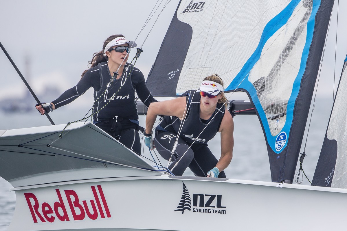 New Zealand’s Alex Maloney and Molly Meech enjoyed the best of the day in the 49erFX, sailing at the front of the pack in all three races.