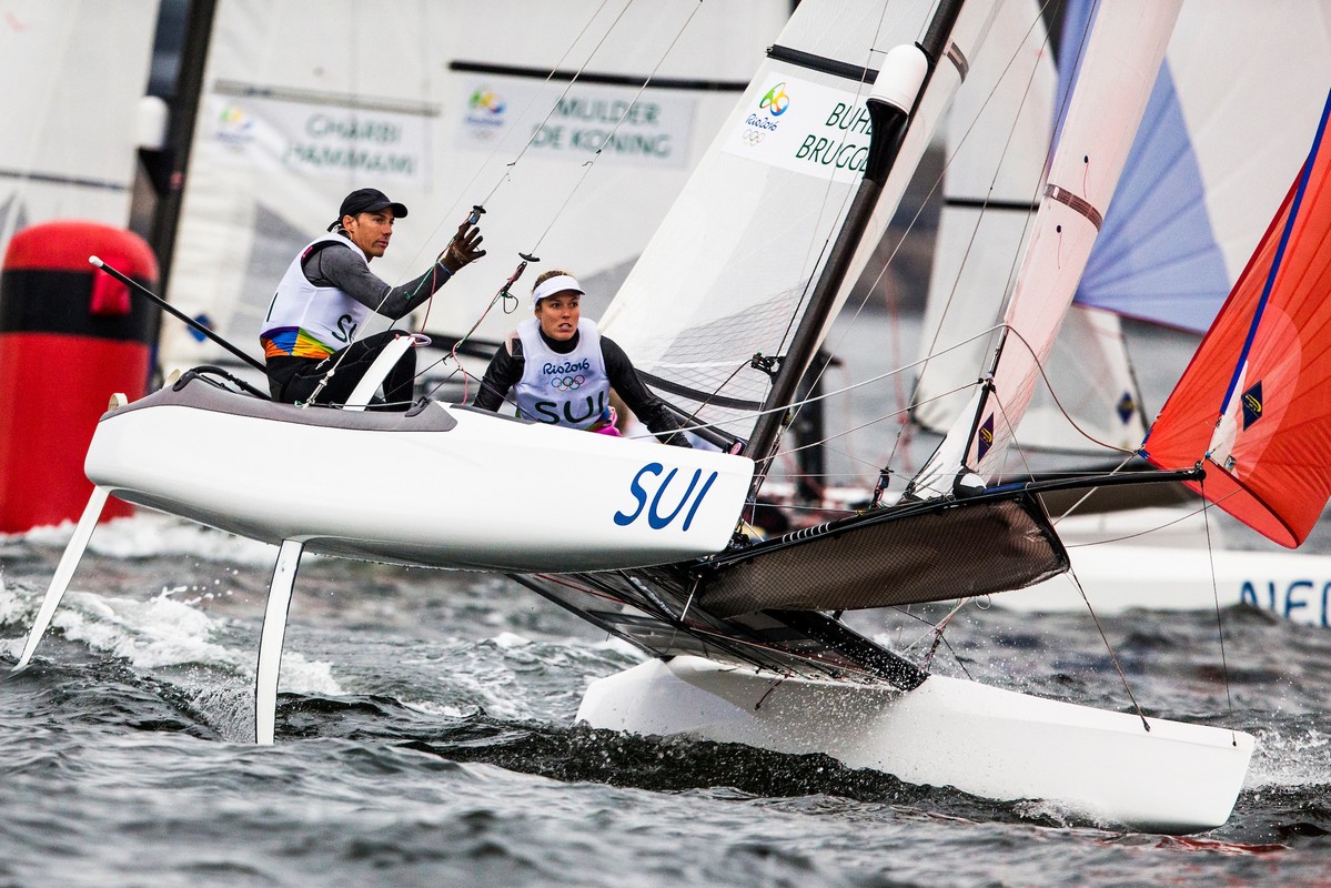 Matias Buhler and Nathalie Brugger (SUI) emerged top of the rankings after two whacky opening races for the Nacra 17 on the notoriously tricky Pão de Açucar (Sugarloaf Mountain) race course. The Swiss are on equal points with Ben Saxton and Nicola Groves (GBR), with Santiago Lange and Cecilia Carranza Saroli (ARG) holding third overall.
