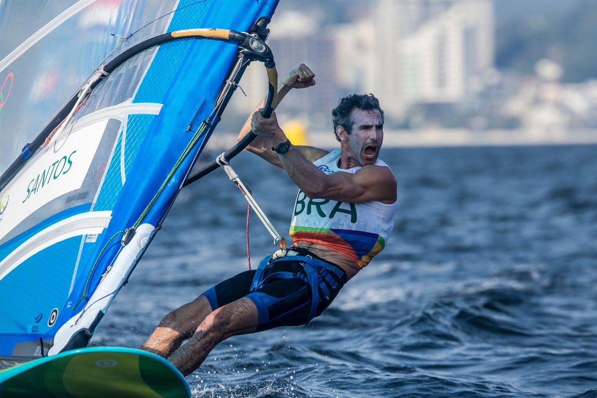 At the halfway stage of their competition, the gold and silver medallists from London 2012 are locked in a close battle for supremacy in Rio, except that it’s Nick Dempsey (GBR) who holds a one point advantage over the reigning Olympic Champion Dorian van Rijsselberghe (NED). There are plenty of others still in contention including third placed reigning World Champion Piotr Myszka (POL), Byron Kokkalanis (GRE), and Pierre Le Coq (FRA). With the breeze forecast to be stronger and waves expected on the Escola Naval race course, perhaps this will be a chance for others to shine.