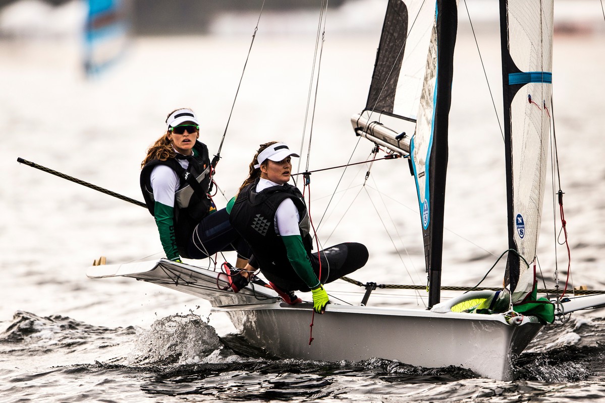 The defending Olympic Champions Jo Aleh and Polly Powrie (NZL) lead the way ahead of Ai Kondo Yoshida and Miho Yoshioka (JPN) just two points behind New Zealand. Hannah Mills and Saskia Clark (GBR) will be looking to make amends for yesterday’s capsize while leading a race, and the Brits sit in third on equal points with the reigning World Champions Camille Lecointre and Hélène de France (FRA).