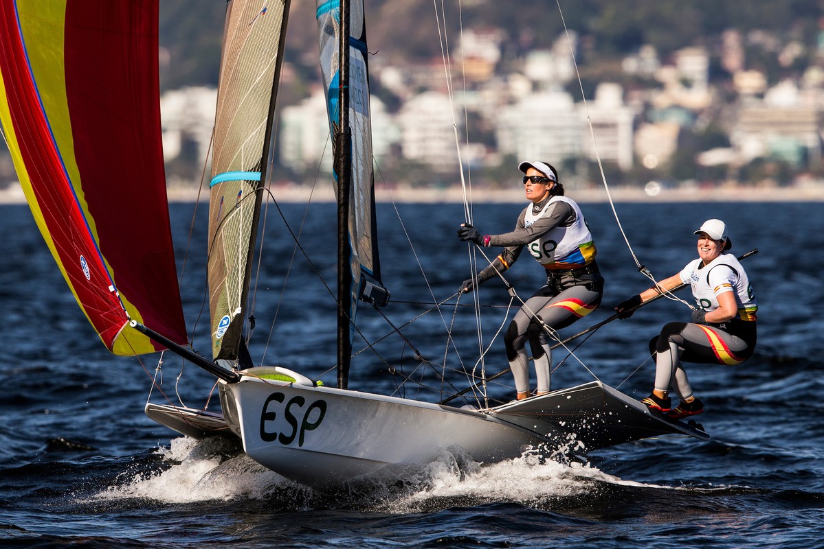 Tamara Echegoyen and Berta Betanzos (ESP) fired two bullets from today’s three races on the Niterói course moving the reigning World Champions to the top of the scoreboard. Behind them are two former World Champion crews, Alex Maloney and Molly Meech (NZL) who are four points behind the Spanish in second, and Martine Grael and Kahena Kunze (BRA) just one point behind the Kiwis in third overall.