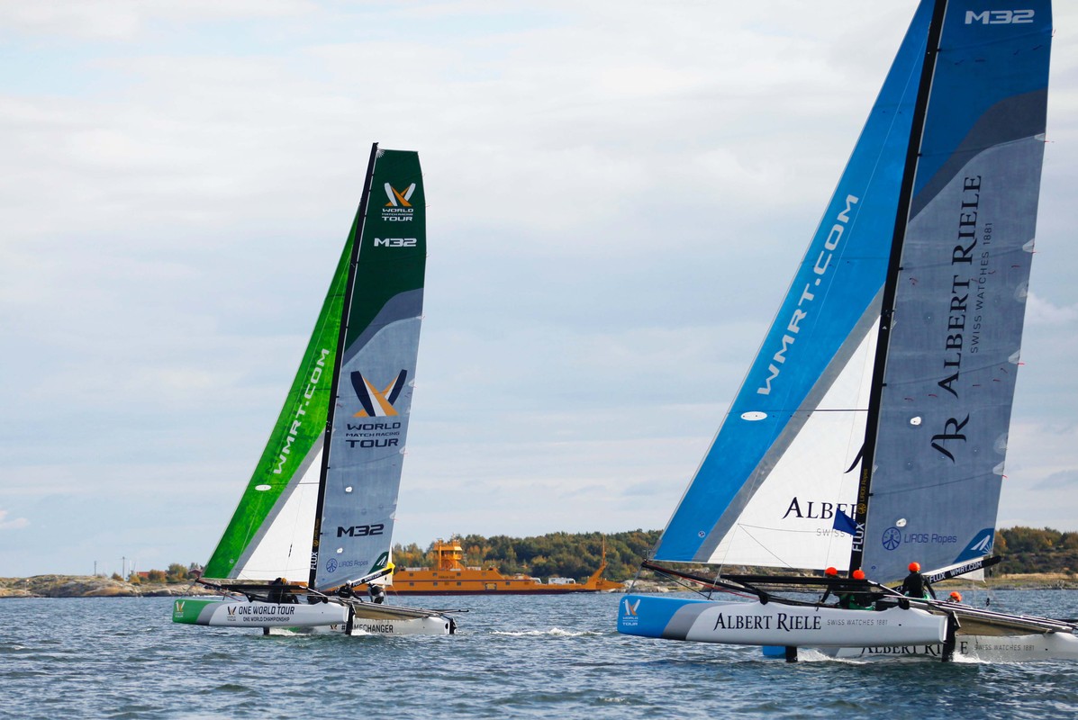 The newly crowned Swedish champion in match racing from the organizing club, Patrik Sturesson, came out of the starting blocks blazing with a win over highly ranked skipper Hans Wallén. “We come into this event with a completely new crew and I haven’t sailed match racing since Marstrand so it took a while to get going” commented Hans Wallén. But the collaboration with newly recruited tactician Keith Swinton, WMRT tour cardholder last season, didn’t need long to generate wins. The oldest skipper in the fleet sits on top with four wins after day one. “This is my first regatta without Anders Dahlsjö on the M32 and we had to reset in order to perform today. We will only improve over the regatta.”