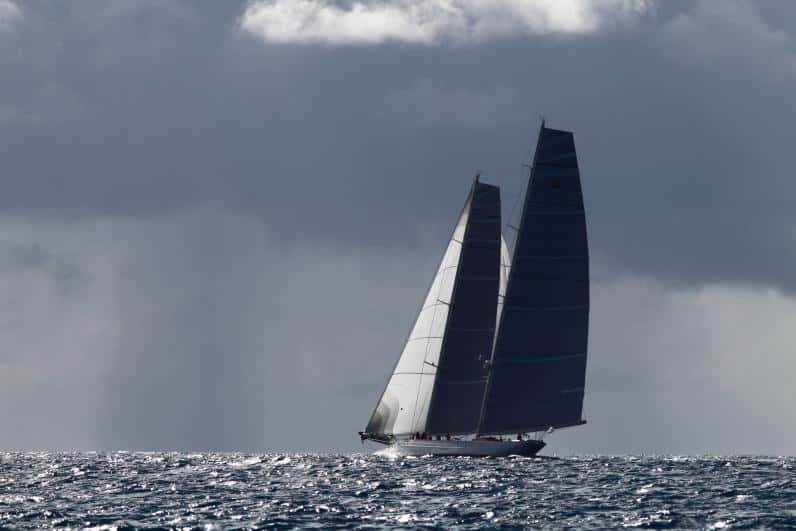 The low pressure system emanating from the north arrived earlier than anticipated, extinguishing the trade winds to provide a windless night for many competitors. However, in the early hours of Tuesday morning a highly unusual north westerly wind was effecting the majority of the fleet rounding St.Kitts and Nevis. The arrival of the wind was accompanied by torrential rain – more Argyll & Bute (Scotland) than Antigua & Barbuda! By dawn on the second day, the majority of the monohull fleet were beating to Saba Island to turn downwind towards St. Barth.