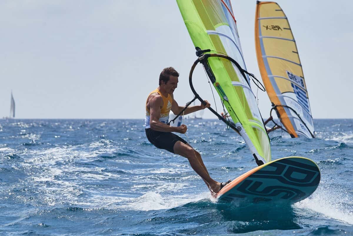 The semi-final saw Frenchman Louis Giard take the race win followed in second by Byron Kokkalanis (Greece) but the drama was behind. Badloe and Camboni were locked in a boat on boat battle going down the final run. On the gybe to the final mark before the finish, Badloe mis-timed the gybe and capsized, falling in the water. Camboni seized the opportunity and sailed past and into the final. Badloe, crossing the line in fourth looked heart-broken, sitting on the board contemplating “that gybe”.