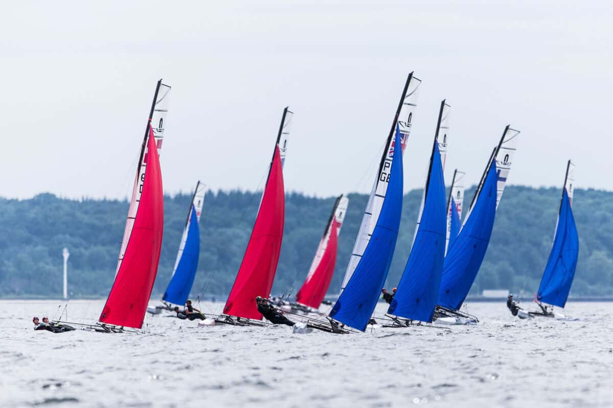 On the second day of their first-ever regatta, the new foiling Nacra 17 fleet found an entirely new way to power their boats upwind – by using the spinnaker.