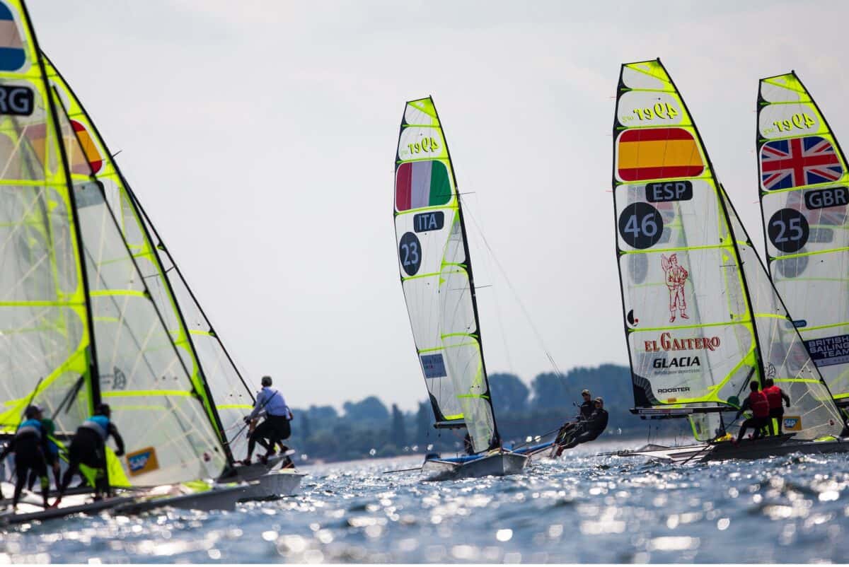 Light and shifty winds continued over Kiel Bay as Finals action began for the top of the Olympic 49er and 49erFX fleets, while the foiling Nacra 17 knocked off three more races in their first-ever regatta in the Olympic multihull’s new flying configuration.