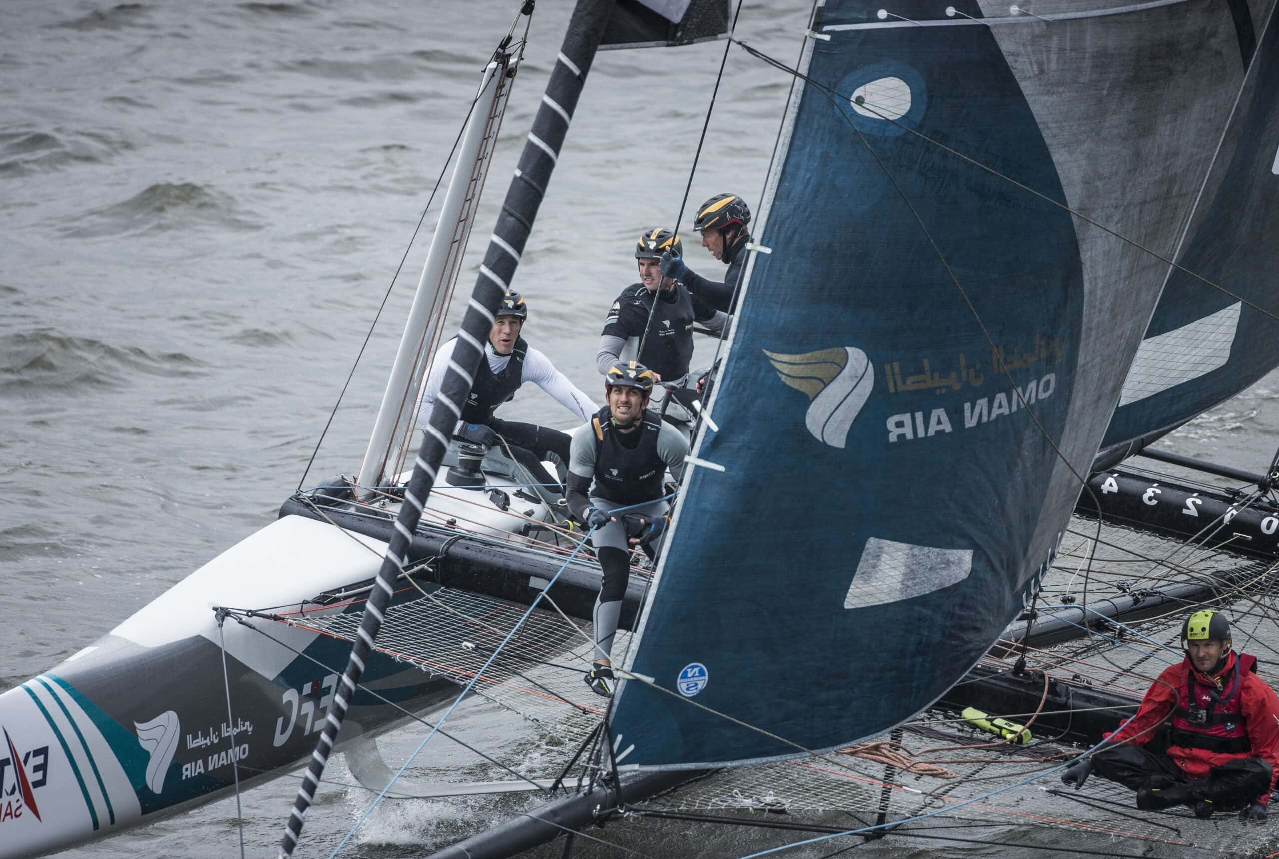 Oman Air maintained its lead while Red Bull Sailing Team climbed from bottom of the table to second after seven nail-biting races on the penultimate day of Extreme Sailing Series? Act 5, Hamburg.