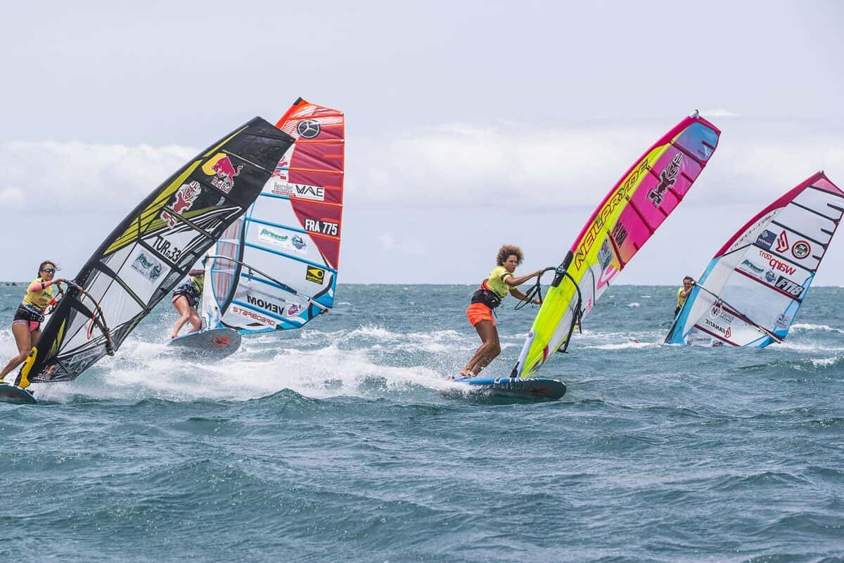 In the very next race Offringa survived another scare after dropping her second gybe in the semifinals, but she managed to recover before going on to secure her second bullet of the day in Elimination Four – which reduces current event leader Delphine Cousin Questel’s (Starboard / S2Maui) lead to just one point, while putting her firmly back in control of the title race as she now holds a comfortable 5.6 point advantage over Lilou Granier in fourth place – when she only requires a top three finish to secure the title.