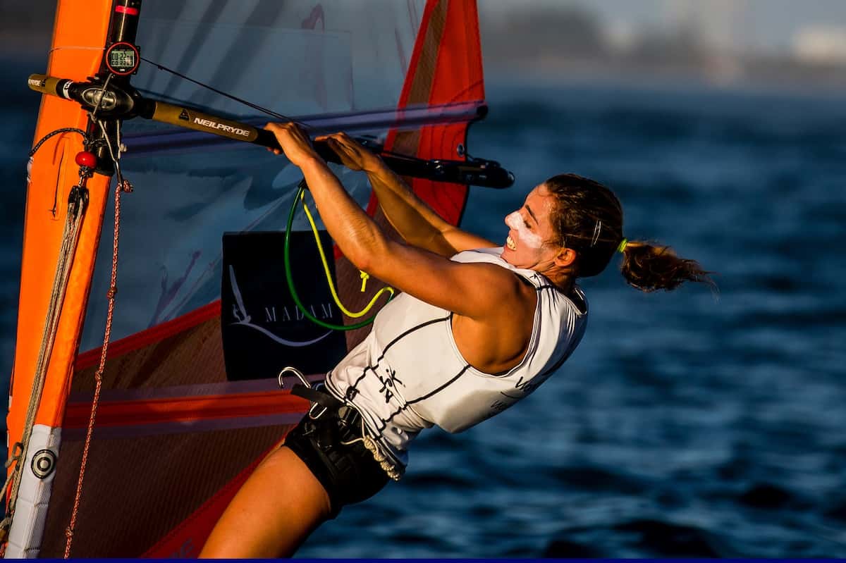 With the wind hovering in the 8 -12 knot range on day 2 of the 2018 World Cup Series Miami, USA, the sailors competing in the Women’s RS:X were forced to pump their 8.5-square-metre sails for the entirety of three 30-minute races.