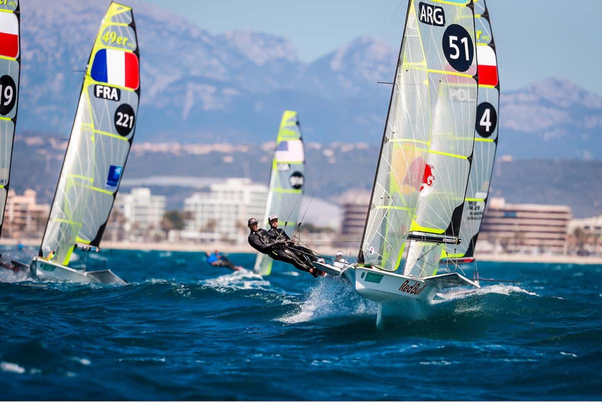 As the pressure ratcheted up in the 49er fleet in the testing, bumpy conditions – the Men’s Skiff is not at all easy in the short, steep and deep Palma chop – the best tally today was returned by Poland’s Lukasz Przbytek and Pawel Kolodinski who moved up to second. After two races today Argentina’s Lange brothers Klaus and Yago had taken up the overall lead but they popped in a 13th to drop to third overall.