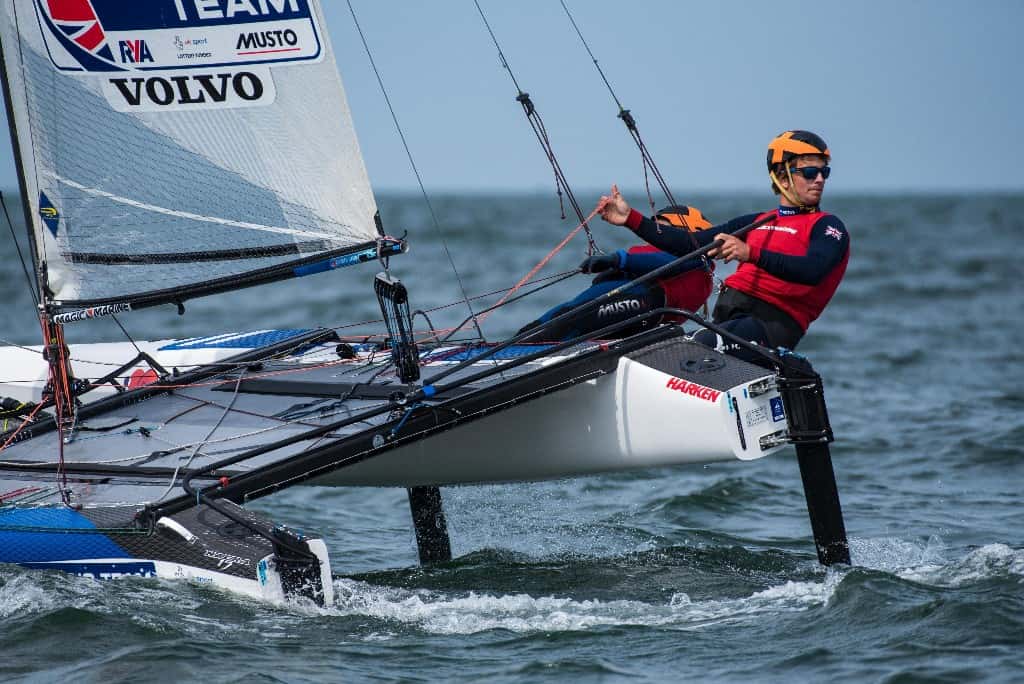 Despite sailing in the Nacra together for 5 years, top Norwegians Nicholas Martinsen and Martine Mortensen were all smiles when they found out they’d not only made their first Gold Fleet at Europeans, but they’d made it comfortably, in 20th place. “It’s great to finally get some results, to be up there,” said Mortensen. Martinsen said they’d made big changes to their campaign this winter, and they are really making a difference. “For the first years we were all by ourselves with no partners or coaches,” he explained. “We now have some support from Norway Sailing Federation, and the coach they provided is really helping our game out.” Martinsen also said that their winter training camp with a number of other teams in Cagliari, Sardinia helped their game as well. “Winter was lots of racing, lots of boathandling, lots of starts, and lots of fun,” said Martinsen.