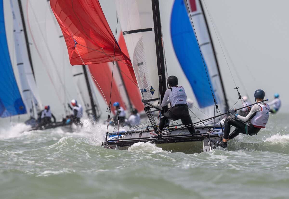 In winning all three races by comfortable margins, Argentina’s Nacra 15 crew of Teresa Romairone and Dante Cittadini have forged a comfortable lead in the open multihull class at the 48th Youth Sailing World Championships.