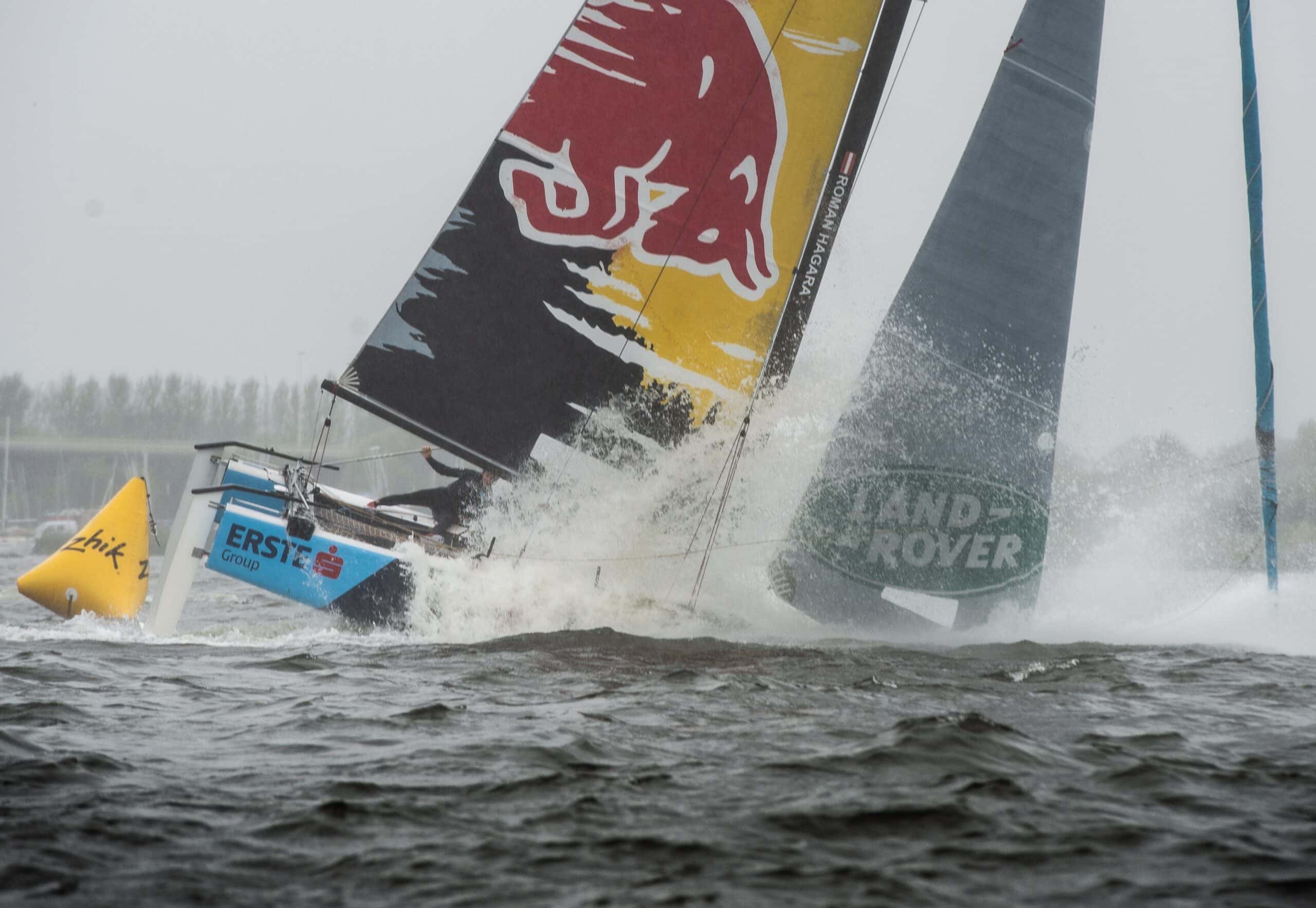 Racing in Cardiff had been hindered throughout the day by strong winds and torrential rain. Early on, Race Management decided not to send the fleet of Flying Phantoms out this morning, with GC32 racing postponed until 15:15 local time.