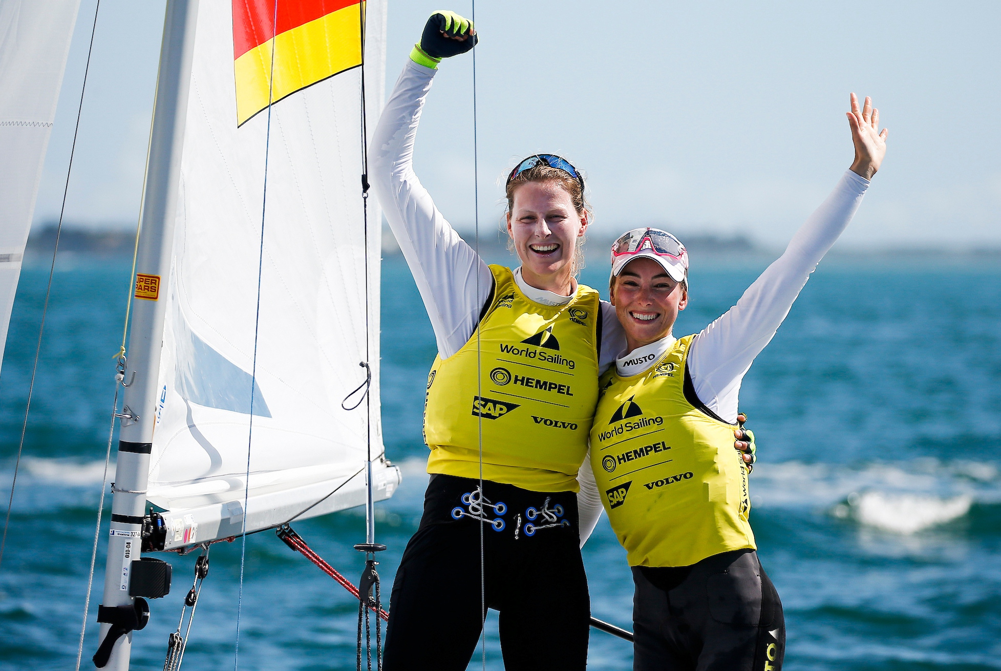 But defending against three other teams is always a challenge, even more so in light air, and on the second lap, the trailing boats found a window of opportunity. First it was Camille LeCointre and Aloise Retornaz (FRA) who were not a medal threat, but would slip by and go on to win the race. Then it was the eventual bronze medalists, Fernanda Oliveira and Ana Luiza Barbachan (BRA). The final dagger came at the leeward mark when Markfort and Loewe and their compatriots Fabienne Oster and Anastasiya Winkel (GER) converged from opposite sides of the course and both slipped inside the British team at the final mark rounding. The order wouldn’t change on the final leg, giving Loewe and Markfort the win, their first medal in a Hempel World Cup Series competition, while the silver went to Oster and Winkel, leaving Mills and McIntyre to ponder how something that had seemed so solid slipped away so quickly.