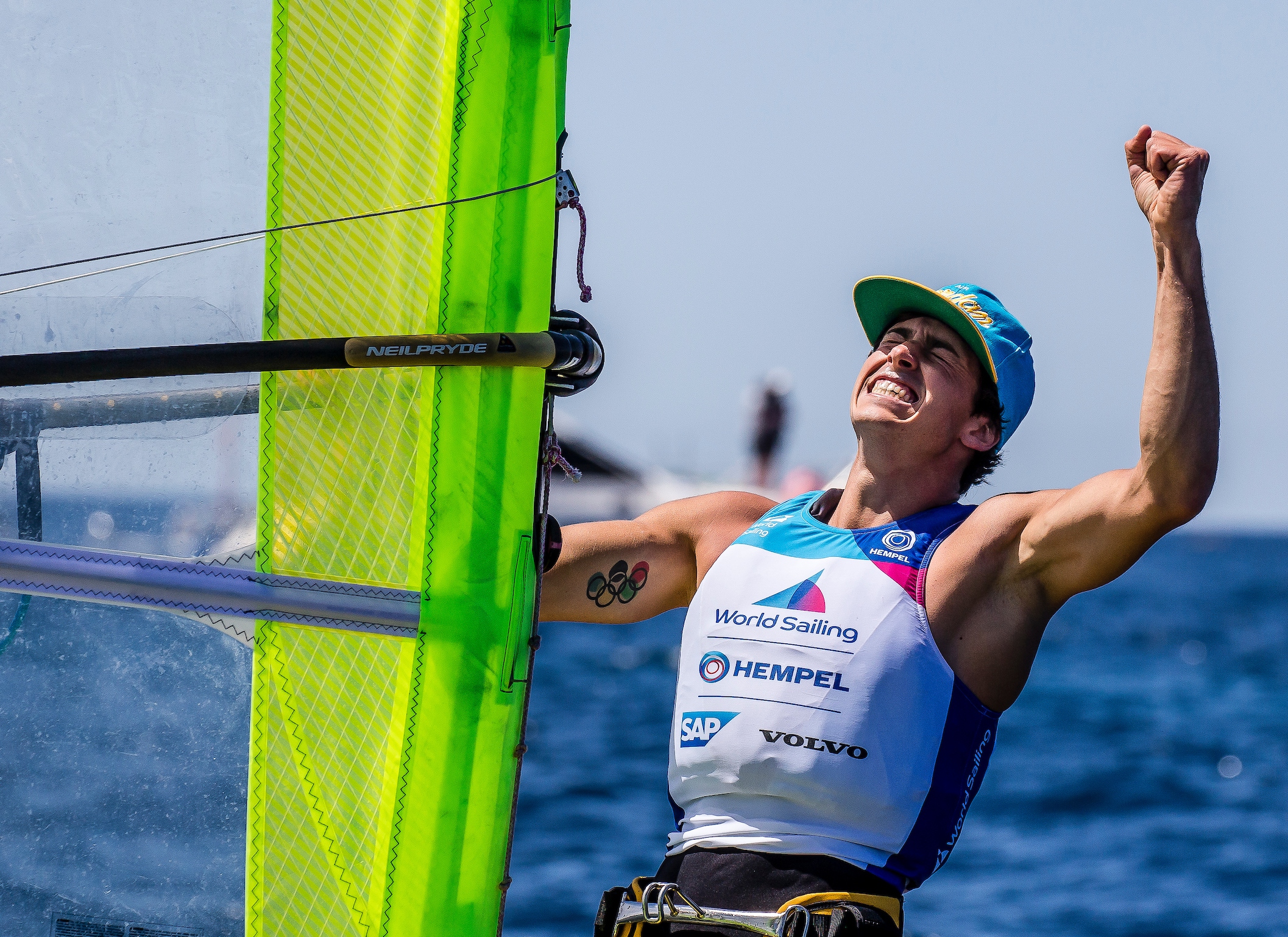 Camboni clinched the lead on the final downwind and claimed the win, punching the air with celebratory relief as he knew he would win a medal.