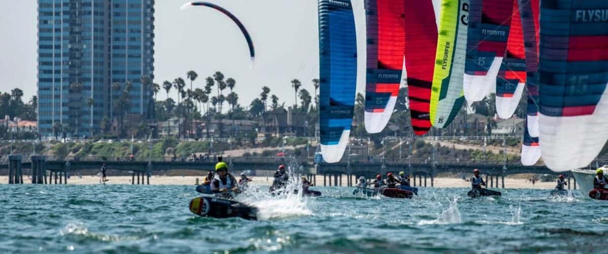 Jessie Kampman/NED98 will again wear the Gold bib, Si Wang/CHN 71, the Silver and Wan LI/CHN68 will wear Bronze. In the Men’s Formula Kite division, Toni Vodisek/SLO55 will again wear the Gold saying, “I’m loving Long Beach!” Kameron Maramenidis/GRE37 on the other hand, had a tough day going from 2 to 6 after a DNC and a collision made for a tough day. Tomorrow’s plan, “no mercy, going for the win!” GBR’s Connor Bainbridge will wear the Silver Bib and CZE’s Vojitech Koska will wear the bronze bib.