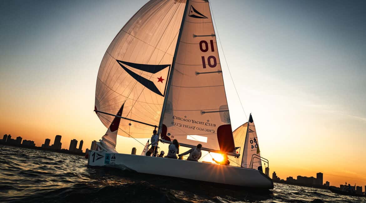 Race officials worked diligently to keep the program moving throughout the day as the breeze shifted throughout the afternoon. Completing eleven flights of the opening round-robin stage, the day’s final matches unfolded against a spectacular backdrop as the sun dipped behind the Chicago skyline.