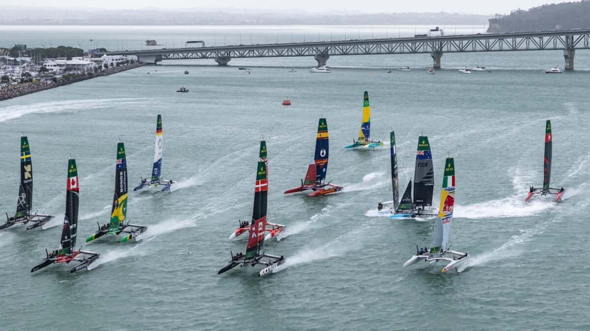 Strong, gusty winds greeted the SailGP teams as 13 took to the start line for the first time ever in front of a Race Stadium heaving with fans.